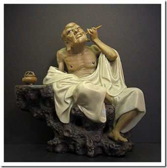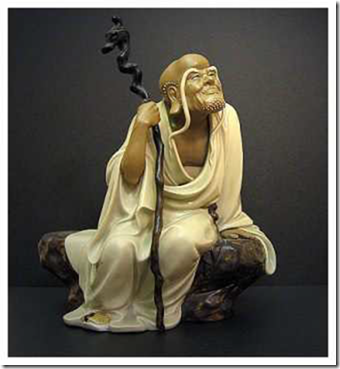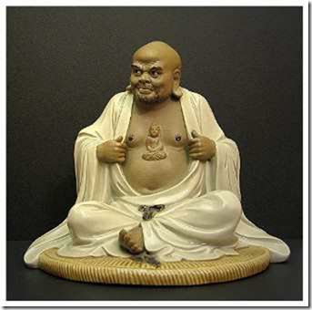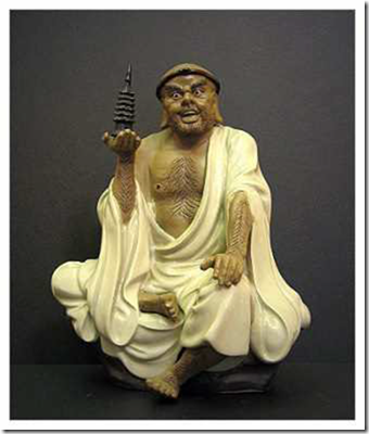 Hình tượng vạch áo bày ngực để hiển lộ tâm Phật. Ngài tên là Thú-bác-ca (Jivaka). Thú-bác-ca vốn là một Bà-la-môn nổi danh, nghe nói thân Phật cao một trượng sáu, Thú-bác-ca không tin nên chặt một cây trúc dài đúng một trượng sáu để đích thân đo Phật. Lạ thay, dù đo bất cứ cách nào, thân Phật vẫn cao hơn một chút. Thú-bác-ca tìm một cây thang dài rồi leo lên thang đo lại, kết quả cũng vậy. Đo đến mười mấy lần, không còn cây thang nào dài hơn mà thân Phật vẫn cao hơn. Lúc này ông thiệt tình khâm phục và xin quy y làm đệ tử. Sau khi xuất gia, trải qua bảy năm khổ hạnh, Ngài chứng quả A-la-hán. Vì muốn kỷ niệm nhân duyên đo Phật mà xuất gia ngộ đạo, Ngài lấy cây sào lúc trước, đi đến chỗ cũ nói: - Nếu Phật pháp là chân lý ngàn đời thì xin cây sào này mọc lại và sinh trưởng ở đây. Nói xong, Ngài cắm cây sào xuống đất. Cây sào bỗng nẩy chồi ra lá. Thời gian sau từ chỗ đó mọc lên một rừng trúc tốt tươi lan rộng cả vùng, người ta gọi nơi ấy là Trượng Lâm. Quần chúng Phật tử kéo đến chiêm bái chứng tích mầu nhiệm của cây gậy đo Phật. Nơi đây rừng núi khô cằn hoang dã, thiếu nước uống nghiêm trọng, tôn giả Thú-bác-ca liền vận thần thông biến ra hai suối nước một nóng, một lạnh để mọi người tha hồ sử dụng. Hai suối này nằm cách mười dặm về phía Tây Nam của Trượng Lâm. Dân chúng vùng này mãi nhớ ơn đức của Tôn giả. Theo Pháp Trụ Ký, ngài Thú-bác-ca là vị La-hán thứ chín, thường cùng 900 vị La-hán trụ trong núi Hương Túy.