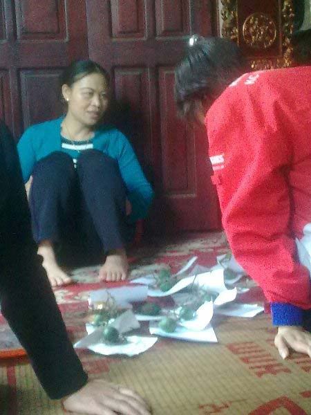 Bà Thi hướng dẫn chúng tôi sắp lễ vào *a và ghi tên vào tờ giấy. Sau một hồi len lỏi, chúng tôi cũng tìm được chỗ ngồi trong phủ và nhanh chóng nhập cuộc.