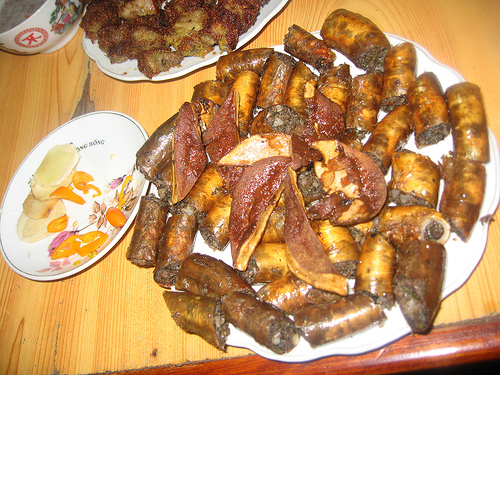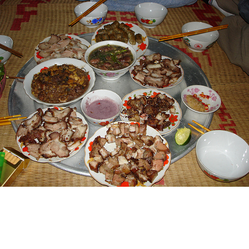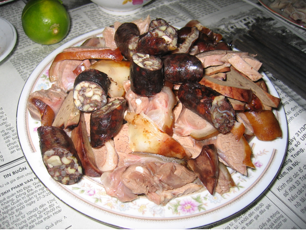 Thịt luộc đỏ tươi, bì vàng màu da đồng, đặt bên cạnh đĩa rau húng chó; vài dĩa riềng thái mỏng tanh; chả nướng, béo ngậy, màu cánh gián; đĩa bún trắng bong nằm cạnh những bát hầm dựa mận màu hoa sim; những liễn xào nấu với chuối “chưa ra buồng” thái con bài; những đĩa dồi tươi hơn hớn, miếng thì trắng, miếng thì hồng, miếng thì tím lợt, đôi chỗ lại điểm những nhát hành xanh màu ngọc thạch... tất cả tiết ra một mùi thơm làn lạt như mùi hoa đồng thảo lại ngồn ngộn như mùi thịt gái tơ... xin hỏi có ai mà chịu được, không thưởng thức một hai miếng làm duyên?