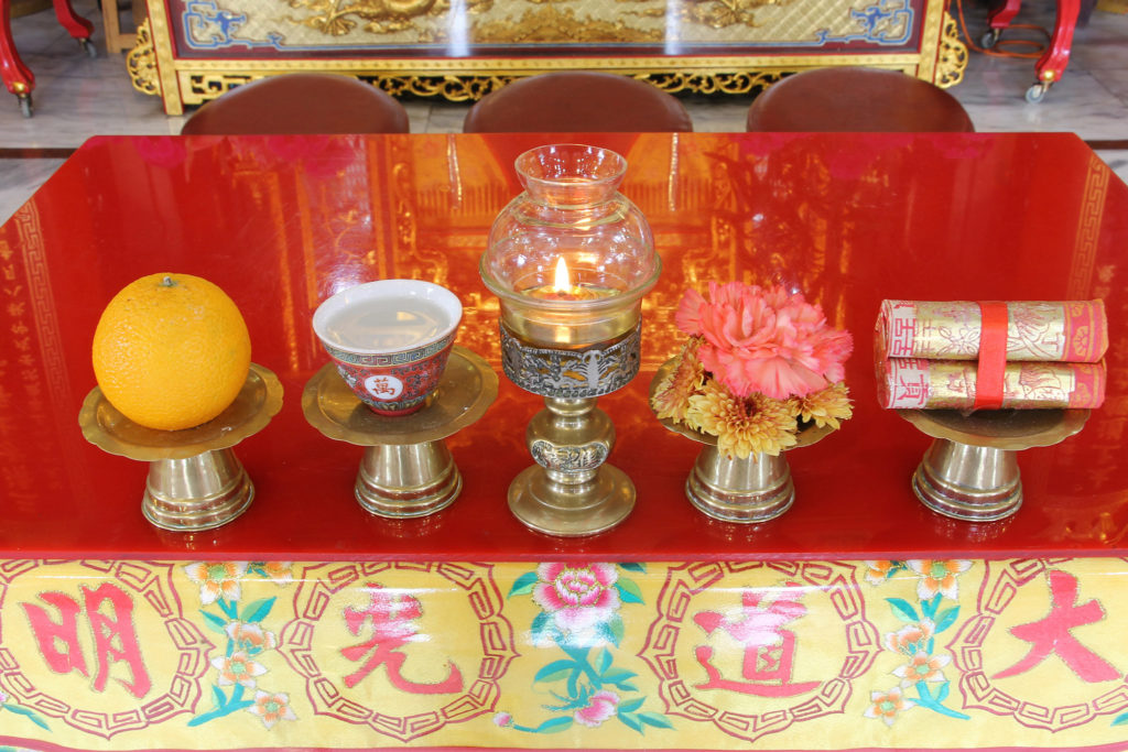 在中央的拜枱上供奉了五樣供品。道 不鼓勵殺生祭祀,而是以香、花、燈 水、果作供品。