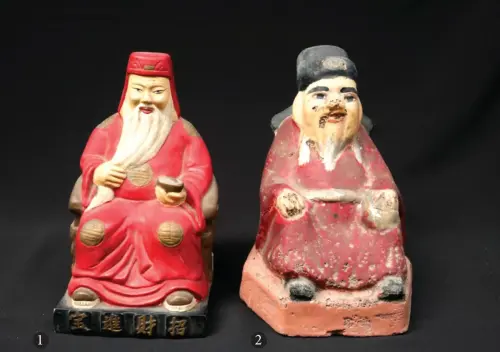 Tượng Thần Tài (trái) chất liệu composite hiện đại, và gốm men màu Lái Thiêu. Nguồn: Sách Thần Đất - Ông Địa & Thần Tài.