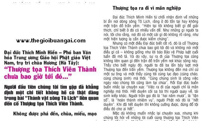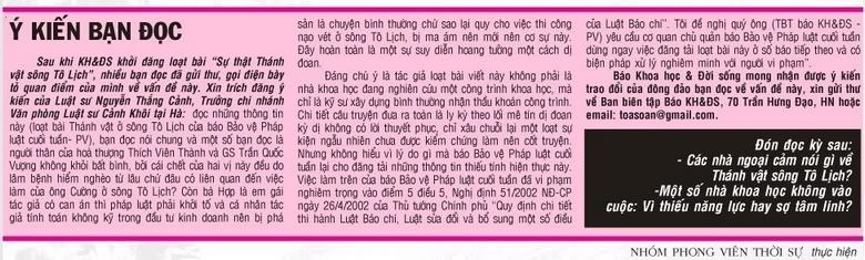 Trở lại sự việc này, Bảo bảo vệ Pháp luật đã đưa một loạt bài với tên gọi " Thánh vật sông Tô Lịch" trong các số báo 13,14,15 từ ngày 31/3 đến 14/4/2007 về vấn đề tâm linh sai sự thật gây hoang mang dư luận./.