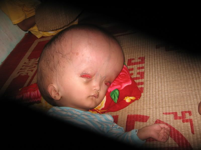 Chỉ cần nhìn tấm ảnh của cháu bé, có lẽ chẳng còn gì để tường thuật nữa phải không các bạn, căn bệnh thật khủng khiếp. Nsb cố gắng chụp cận cảnh để mọi người nhìn rõ bệnh trạng của cháu Hiệp. Thật nan giải, Nsb nghĩ vô phương cứu chữa. Cái đầu càng ngày càng to vì chứa nước, kéo căng hết da ở đầu và trán, khiến da ở mí mắt cũng bị kéo căng mà không nhắm được mắt.