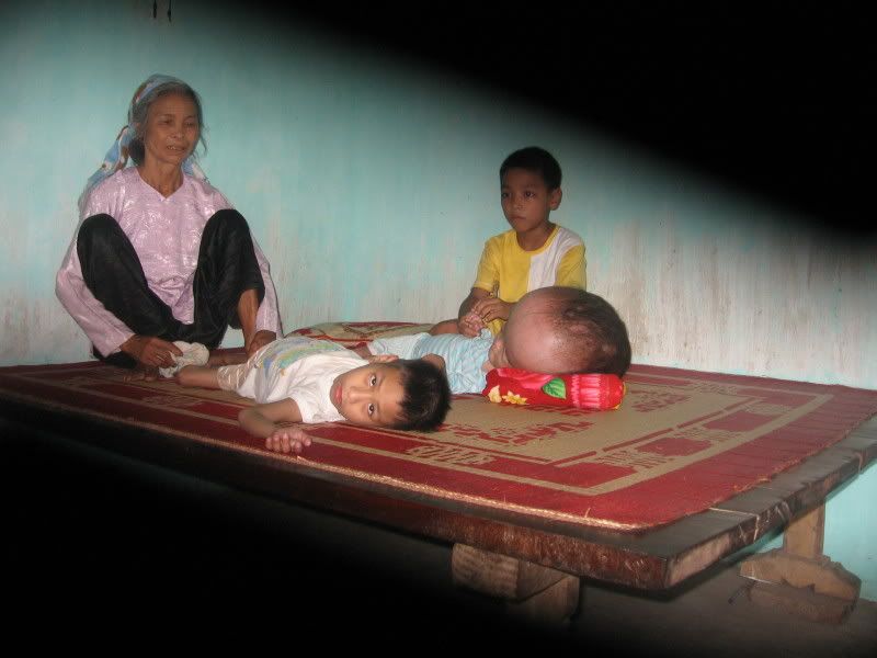 Ba đứa con, thì đứa lớn nhất 13 tuổi ( nằm cạnh cháu Hiệp), cũng bị tàn tật bẩm sinh : bại não, chân tay cong queo , mồm méo, điếc, câm,nằm một chỗ hoặc ngồi dựa trong xe ( không phải xe, gọi là cái gì nhỉ ) . Nhỏ như 1 đứa bé 4,5 tuổi. Có duy nhất là đôi mắt còn sáng, nhưng đôi lúc dại đi hoặc lác . Đứa con trai giữa 8 tuổi thì bình thường , nhưng học không được, Nsb nghĩ chỉ còn em là niềm hi vọng cho ông bà nội và bố mẹ cháu.