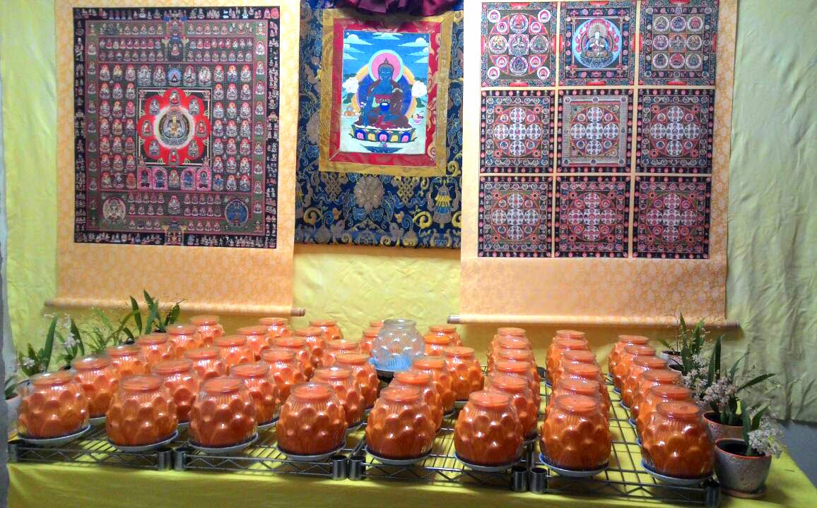 The quantity of medicine should be in the form of pulverized pills depending on the number of days accordingly. The powder should be mixed with stone honey and then made into pill form. After that they should be stored in a silver container. The mantri should recite maha- and hina-hrdaya-mantra for 1,080 times each. He/she should hold the medicine and recites mantra once; and then touch the medicine onto the bodhisattva’s feet for 108 times. Once done, the medicine is stored in a clean and secret place.