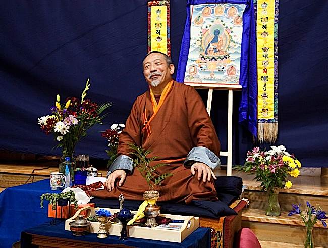 His Eminence Zasep Tulku Rinpoche giving teachings on Medicine Guru to a large audience.