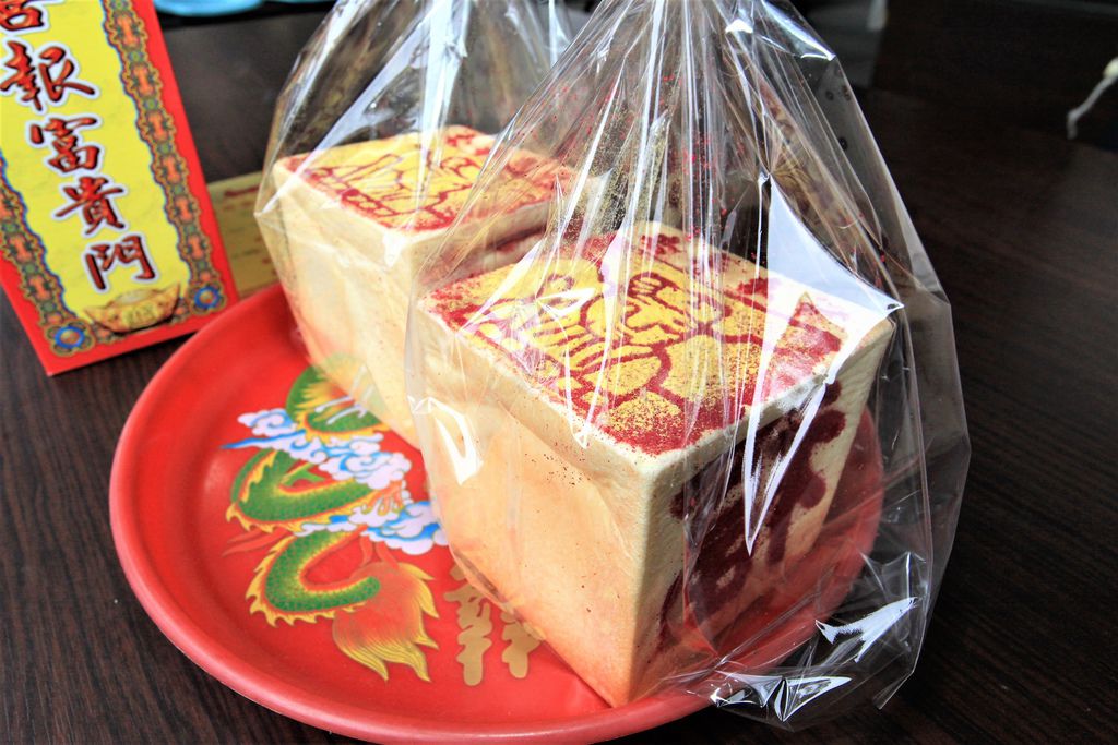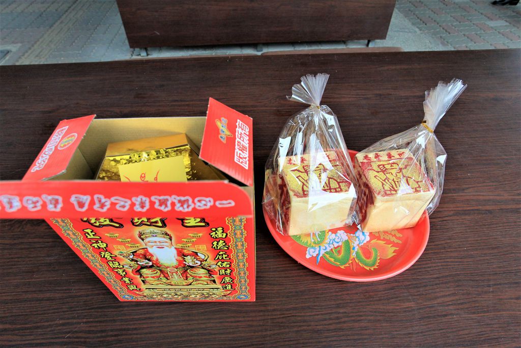 另外還有一種是專為土地公而設 的『福金』或稱為『土地公金』(圖3-32),福金只能用於祭拜福德正神,或 司財寶的神明時使用,可分為大箔福 和小箔福金兩種。二種福金都是二寸 方,差別在於所貼金箔大小不同,大 箔福金貼上八分金箔,而小箔福金則 貼四分的金箔儘管金紙種類繁多,且使 用階級分明,但現今市面上的金紙鋪 為了銷售方便,往往只將金紙分成三 種類: