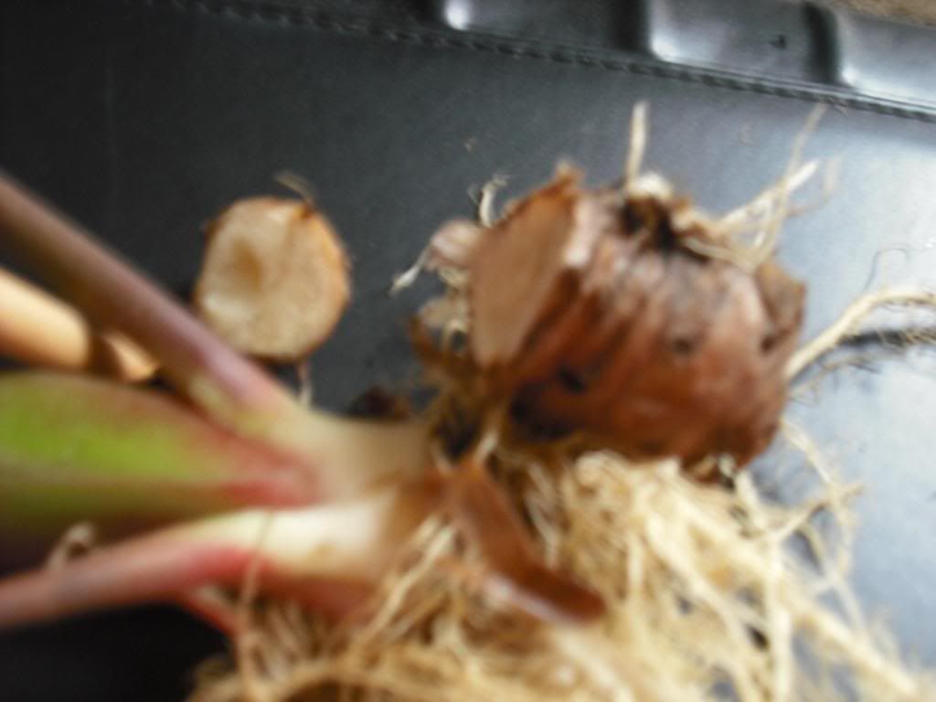 2/. Thứ 2 là mấy bụi nàng thâm của TB và TH: loại nàng thâm này thường có 2 dạng lá: 1 loại phiến lá tròn to khoảng 20cm rìa lá màu đỏ, bên trong màu xanh. Loại thứ 2 phiến lá dài, rìa lá không có màu tím. Cả 2 loại này củ đều có màu tím thẫm như củ dền, rất quí hiếm. Có 1 loại thường cũng giống vậy nhưng củ chỉ có màu tím đốm trắng (giá khoảng 40 ngàn/kg, thường thấy bán trên khu vực An Giang). Loại nàng thâm thứ của TB với TH thì jimmy_nguyen cũng có 1 bụi. Loại nàng thâm này cũng có 1 đặc điểm mà không biết TB và TH có để ý không? Đó là cứ hễ cây ngải lên được 3 lá thì sẽ trổ hoa 1 lần, trổ hoa xong thì lại lên mầm mới.